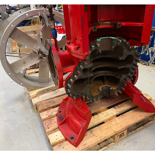 Consequently, the back-up pump is taken into IRON workshop where the work begins. The pump housing needs machining and special sealing rings must be manufactured. The pump is upgraded from 16 til 25 bar flange version, and the pump casing is turned to the original CCW settings.